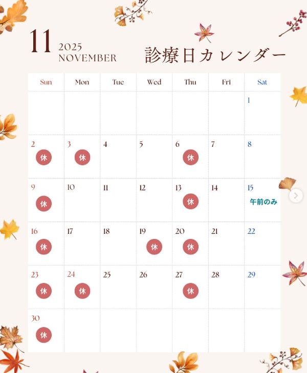2025.11.04 11月の休診日のお知らせ 【11月の休診日のお知らせ】 平素より当院をご利用頂き誠にありがとうございます。 11月はカレンダーの日程を休診とさせていただきます。 < 前の記事 新着一覧